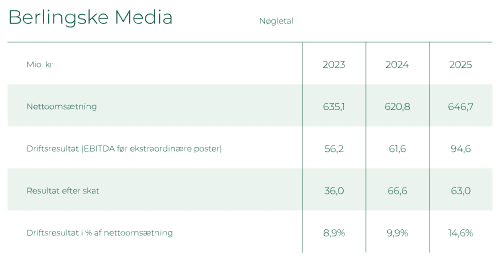 Berlingske Media udgiver fire medier: Berlingske, Weekendavisen, B.T. og Euroinvestor. Årsregnskabet for 2025 afspejler, at både Berlingske og Weekendavisen ligesom de foregående år leverer stigende omsætning fra digitale kanaler og stabil omsætning fra aviserne. For begge medier var der tale om støt fremgang og stabile overskud.